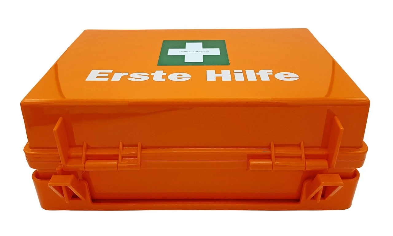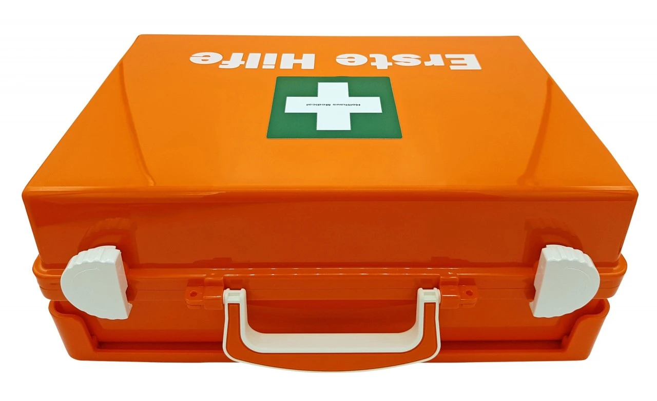 Med vægbeslag. Indhold i henhold til DIN 13157. Indeholder et udvalgt sortiment med vigtige forbindingsmaterialer. Mål: 310 x 210 x 130 mm