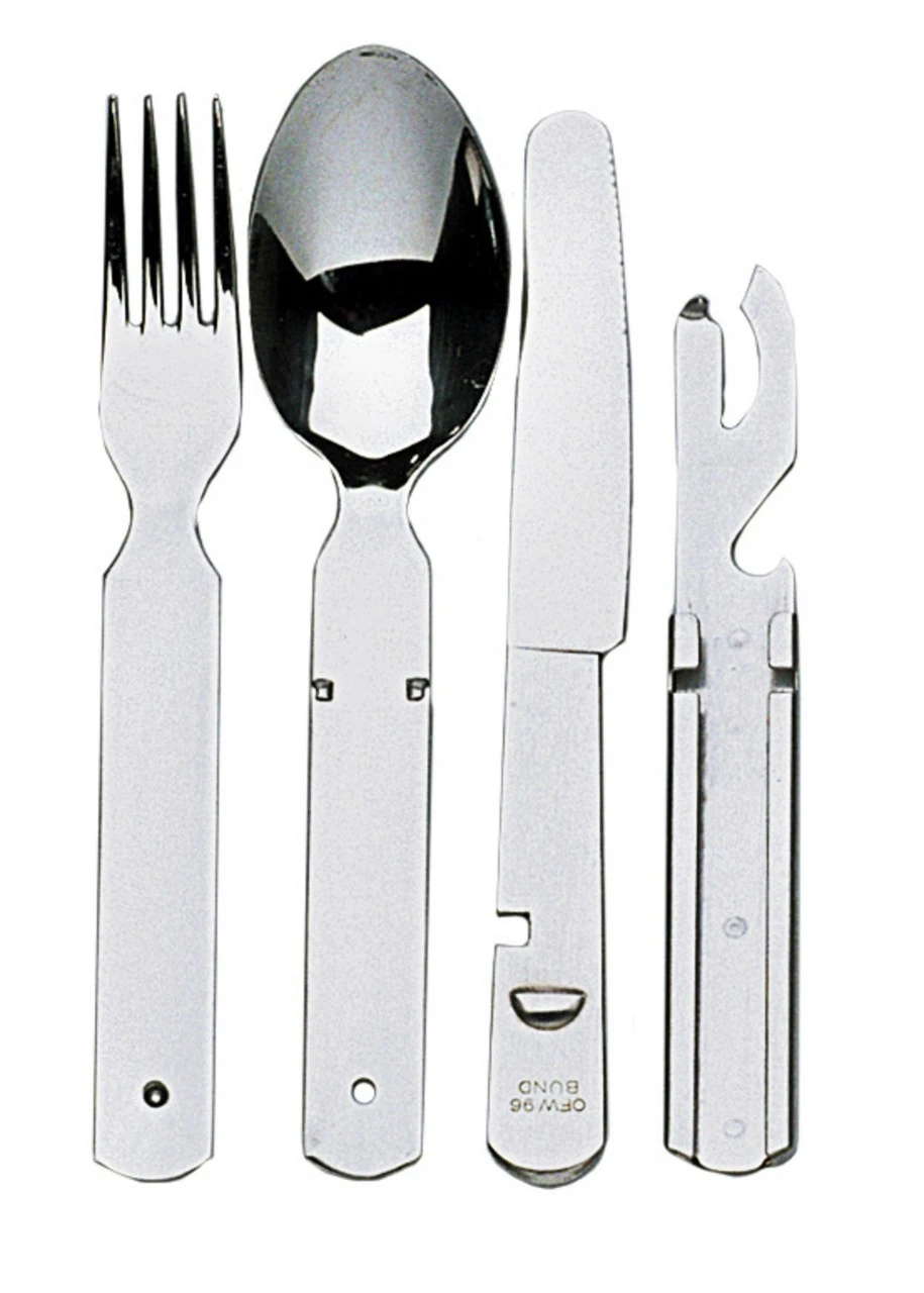 Rustfrit. Stilfuldt og enkelt design. Ske, gaffel, kniv og dåseåbner med flaskeåbner. Længde ca. 20 cm. Vægt 195 g.