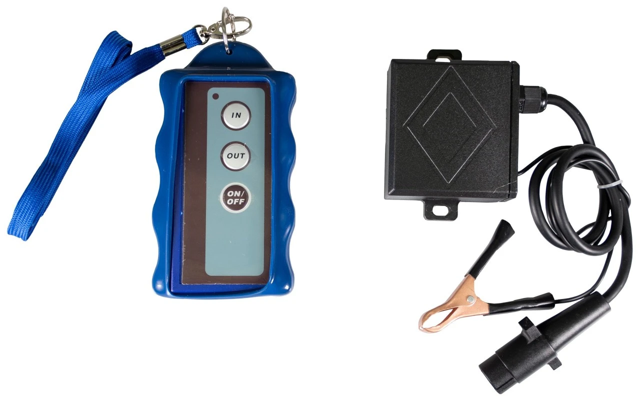 Radiofjernbetjening med trepolet stik for tilslutning til vores 12-volts rebspil fra Horntools. Leveres ekskl. batteri.